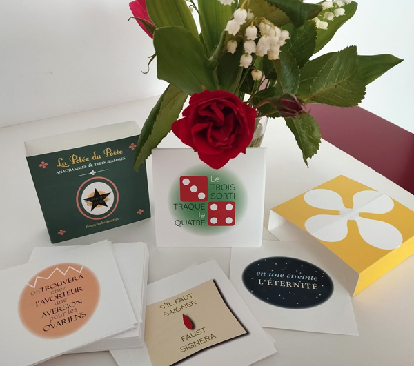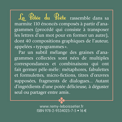 LA POTEE DU POETE Anagrammes & Typogrammes comportant 110 fiches, dont 70 énoncés et 40 compositions graphiques de l'auteur édition originale en 200 exemplaires, tous numérotés sur papiers Fedrigoni Arena rough natural et Old Mill premium white mai2025 | format 9 x 9 cm ISBN 978-2-9534025-7-5 ![]() |